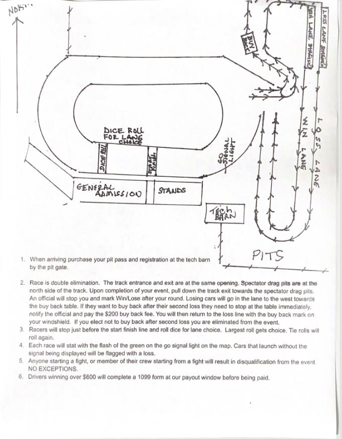 5.. Race is double elimination. The track entrance and exit are at the same opening. Spectator drag pits are at the north side of the track. Upon completion of your event, pull down the track exit towards the spectator drag pits. An official will stop you and mark Win/Lose after your round. Losing cars will go in the lane to the west towards the buy back table. If they want to buy back after their second loss they need to stop at the table immediately, notify the official and pay the $200 buy back fee. You will then return to the loss line with the buy back mark on your windshield. If you elect not to buy back after second loss you are eliminated from the event.