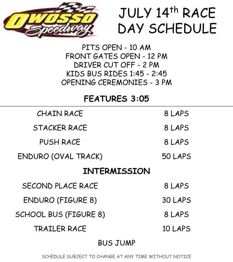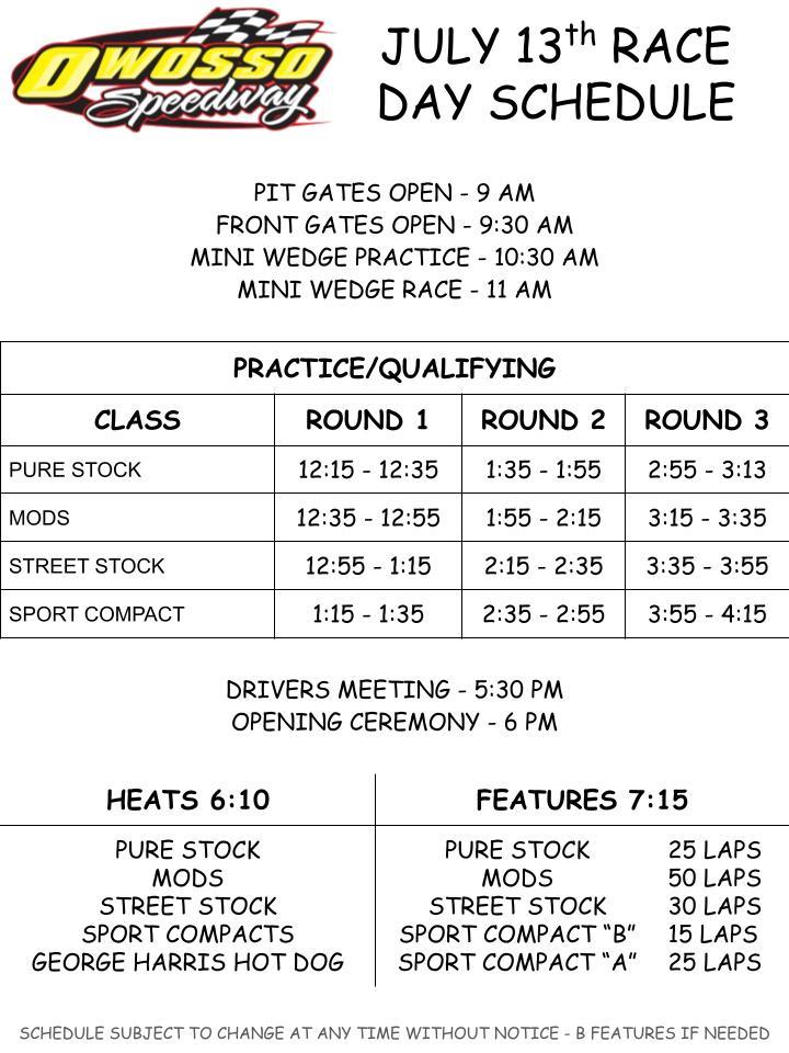 1306 7/12/2024Owosso Speedway Race Day Schedules for 7/13 & 7/14 . Submitted By: Chris Fobbe Article Media Back to News