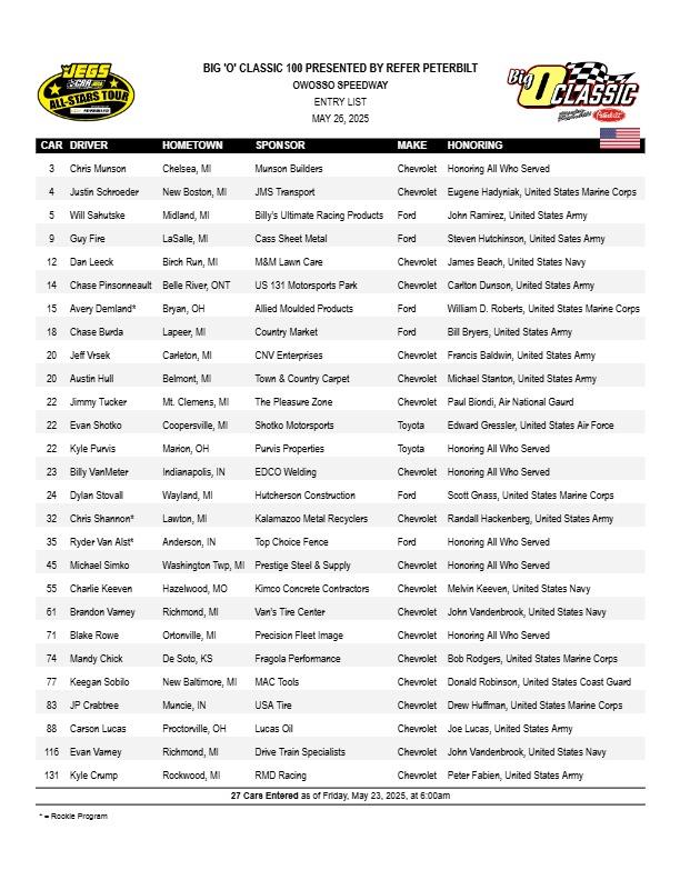 4466 5/23/2025Owosso Speedway Entry List and Race Day Schedule for Big O Classic Monday, May 26th . Submitted By: Chris Fobbe Article Media Back to News