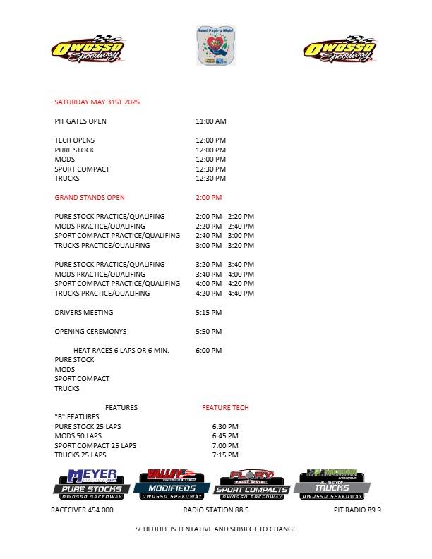 4399 5/29/2025Owosso Speedway Race Day Itinerary for May 31st . Submitted By: Chris Fobbe Back to News